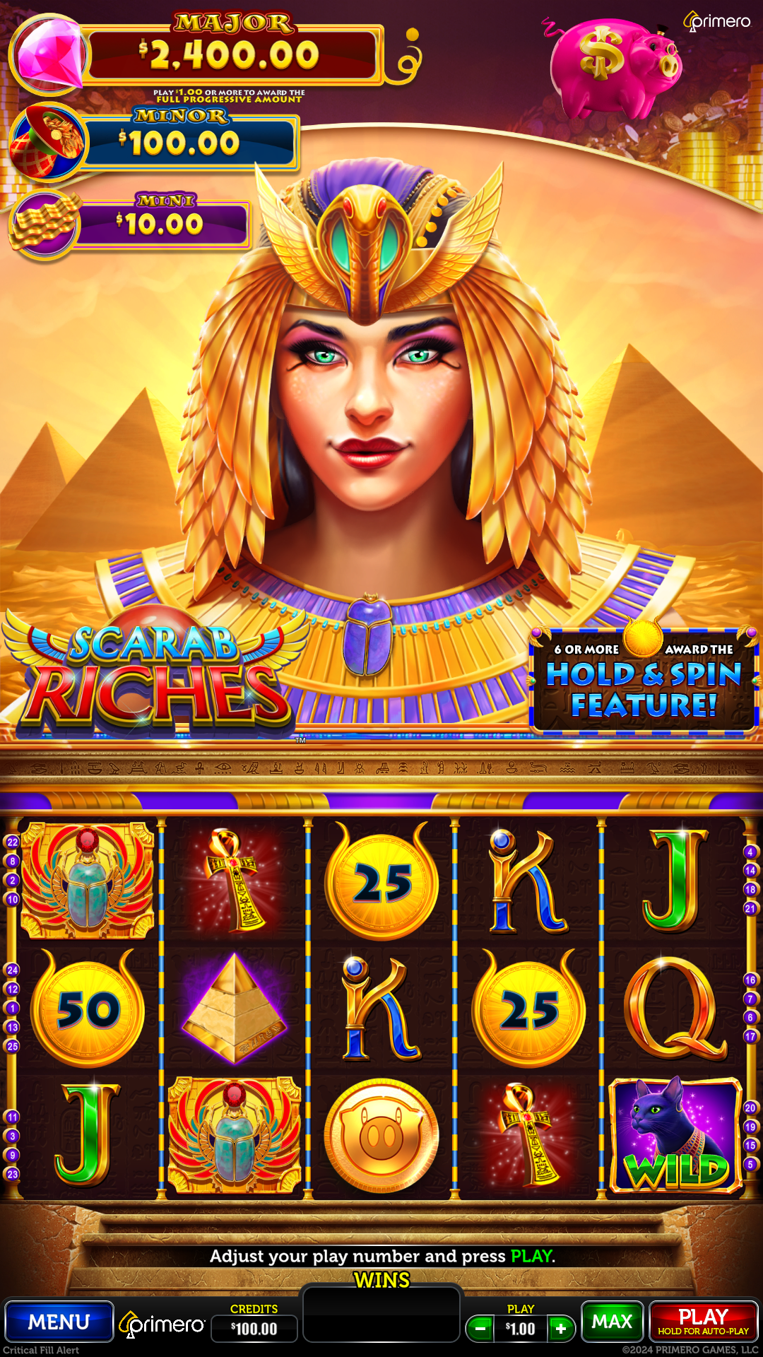 Scarab Riches – 5 Reels, 25 Lines, Hold and Spin Bonus.